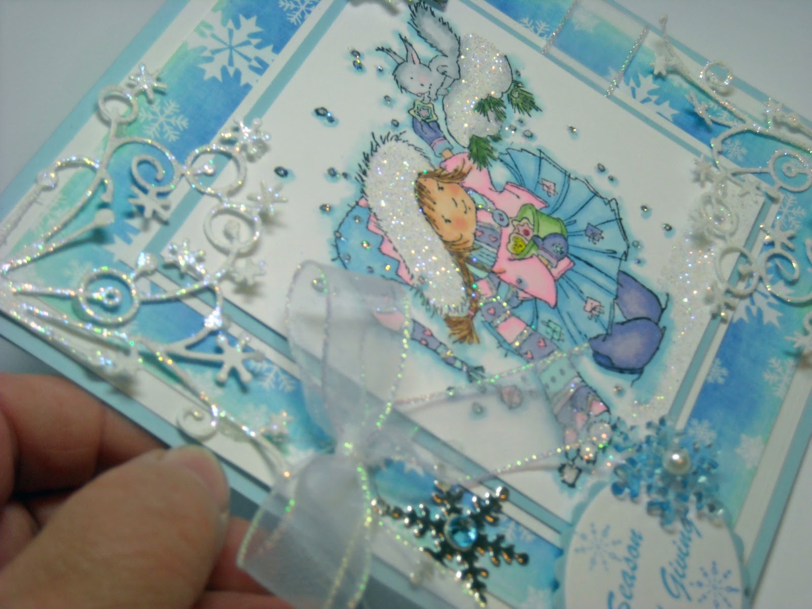 This is my card for Going Grey with Scrap-Creations challenge this week. The theme for the week is Christmas in July. I just got this Nellie Snellen (I just love all their stamps) Christmas stamp in June at a Stamping Convention and couldn't wait to color it. I love making my Christmas/Winter cards in the color blue so I couldn't resist doing this one in blue too! I also glittered almost everything on the card, the second pic I hope shows all the sparkle better than the first picture. It is not too late to come play along with us so we hope you hop over and play. I can't wait to see what you created.